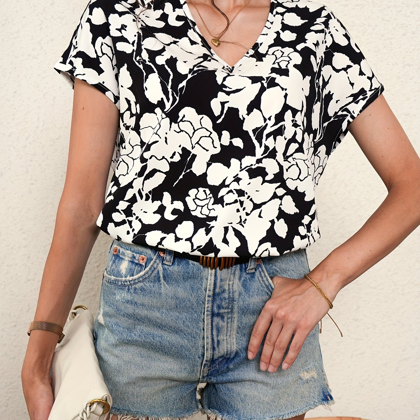 Casual Floral Print V-neck Blouse, Short Sleeve Blouse For Spring & Summer, Women’s Clothing