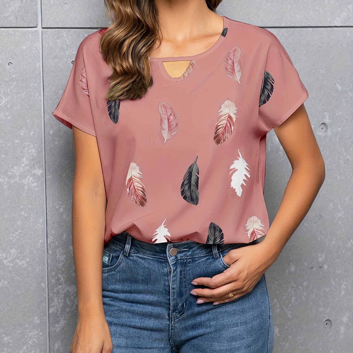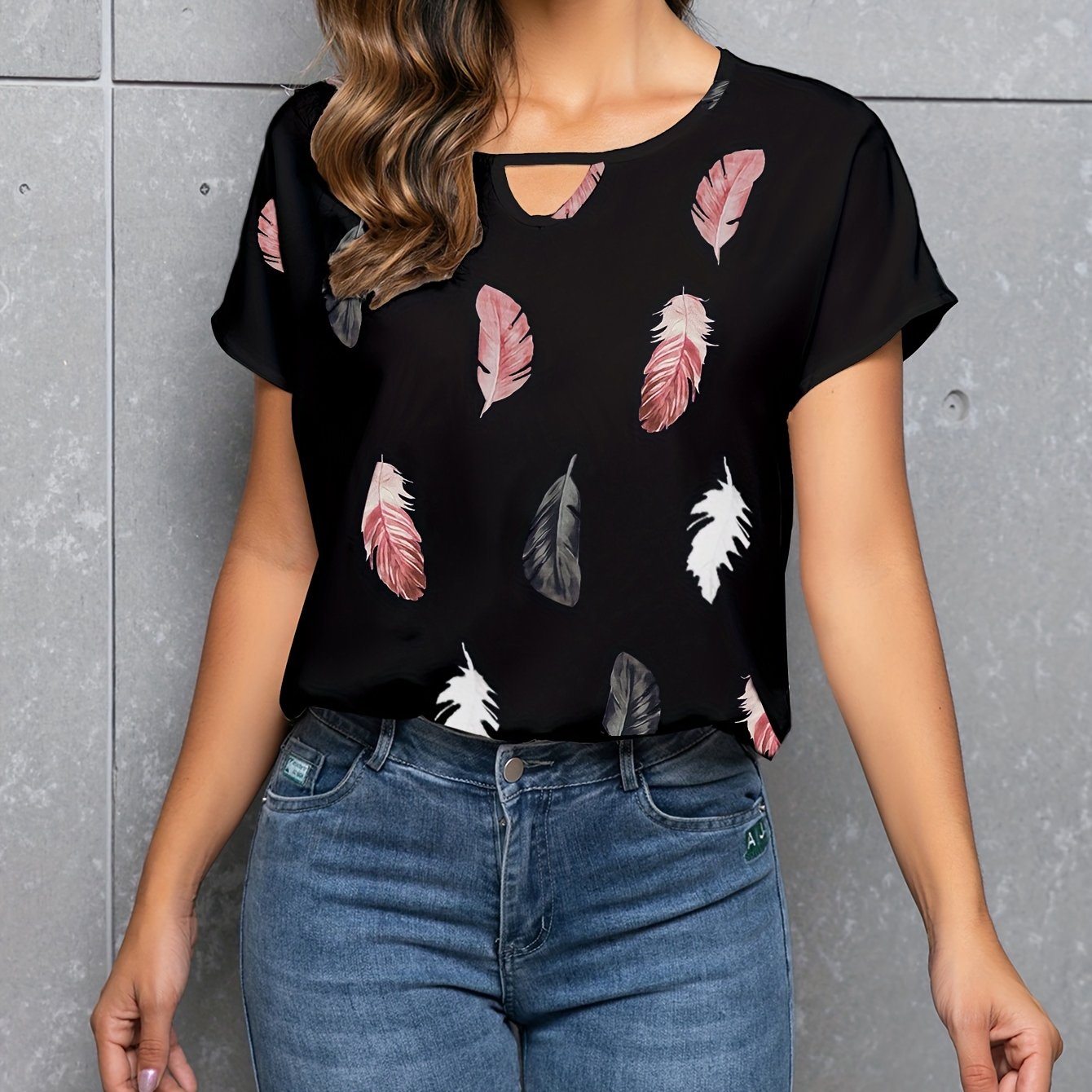 very good Feather Print Crew Neck Blouse, Casual Cut Out Short Sleeve Blouse For Spring & Summer, Women’s Clothing – 100% recommend