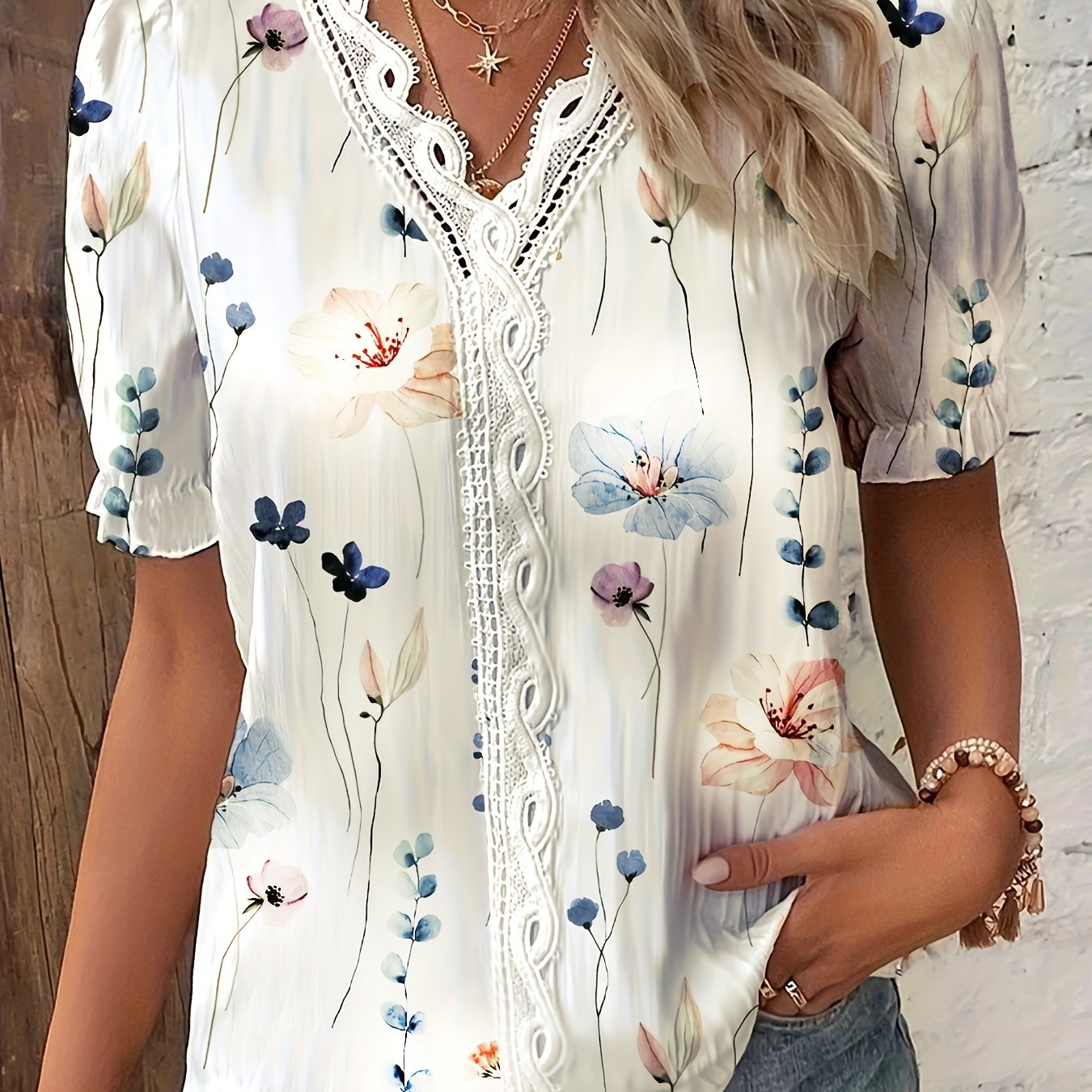 i can say is that Floral Print Contrast Lace Blouse, Casual V Neck Short Sleeve Summer Blouse, Women’s Clothing is great. I like it.