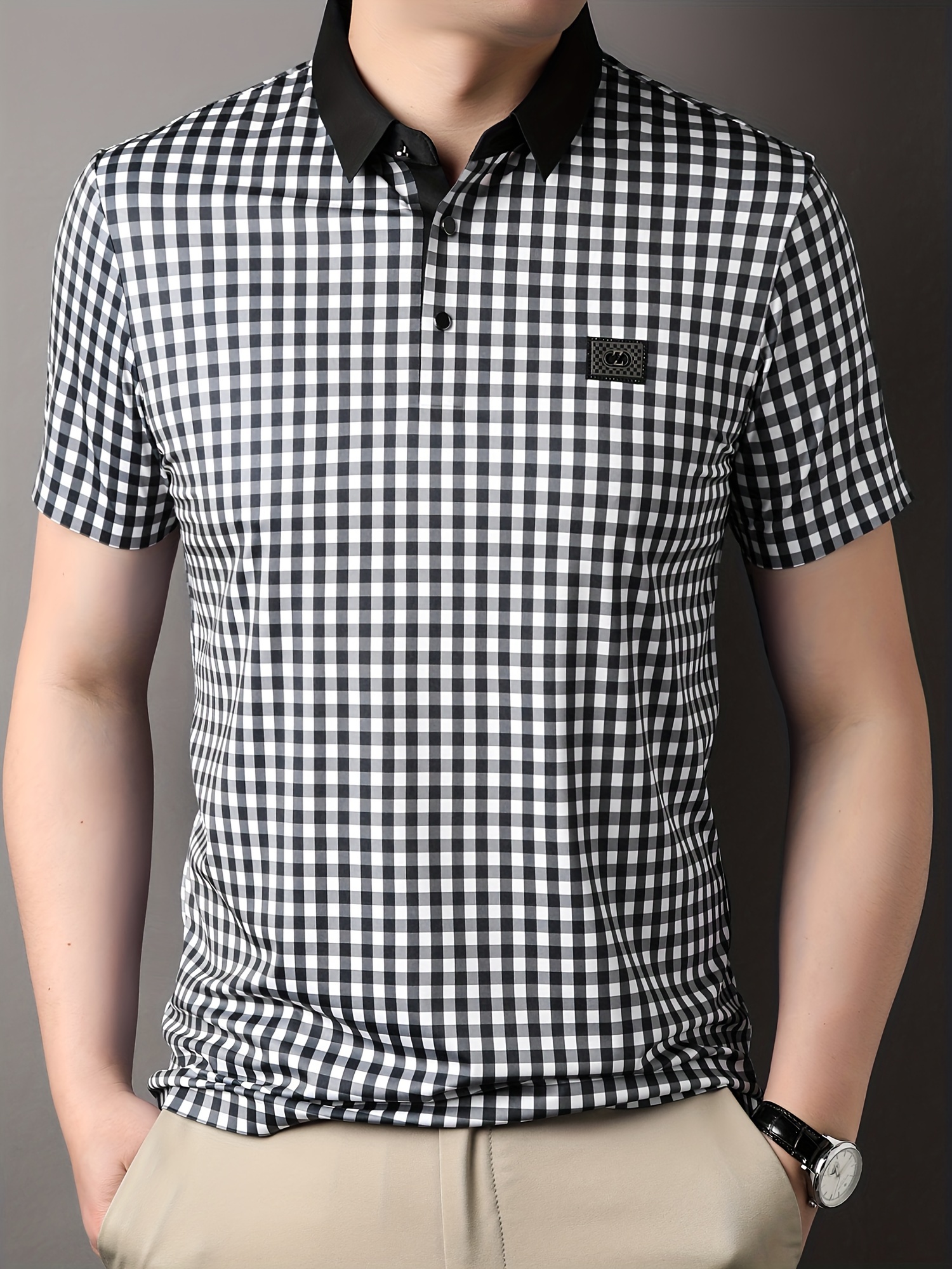 Retro Mature Checkered Men’s Color Block Short Sleeve Lapel Golf Shirt For Summer Outdoor