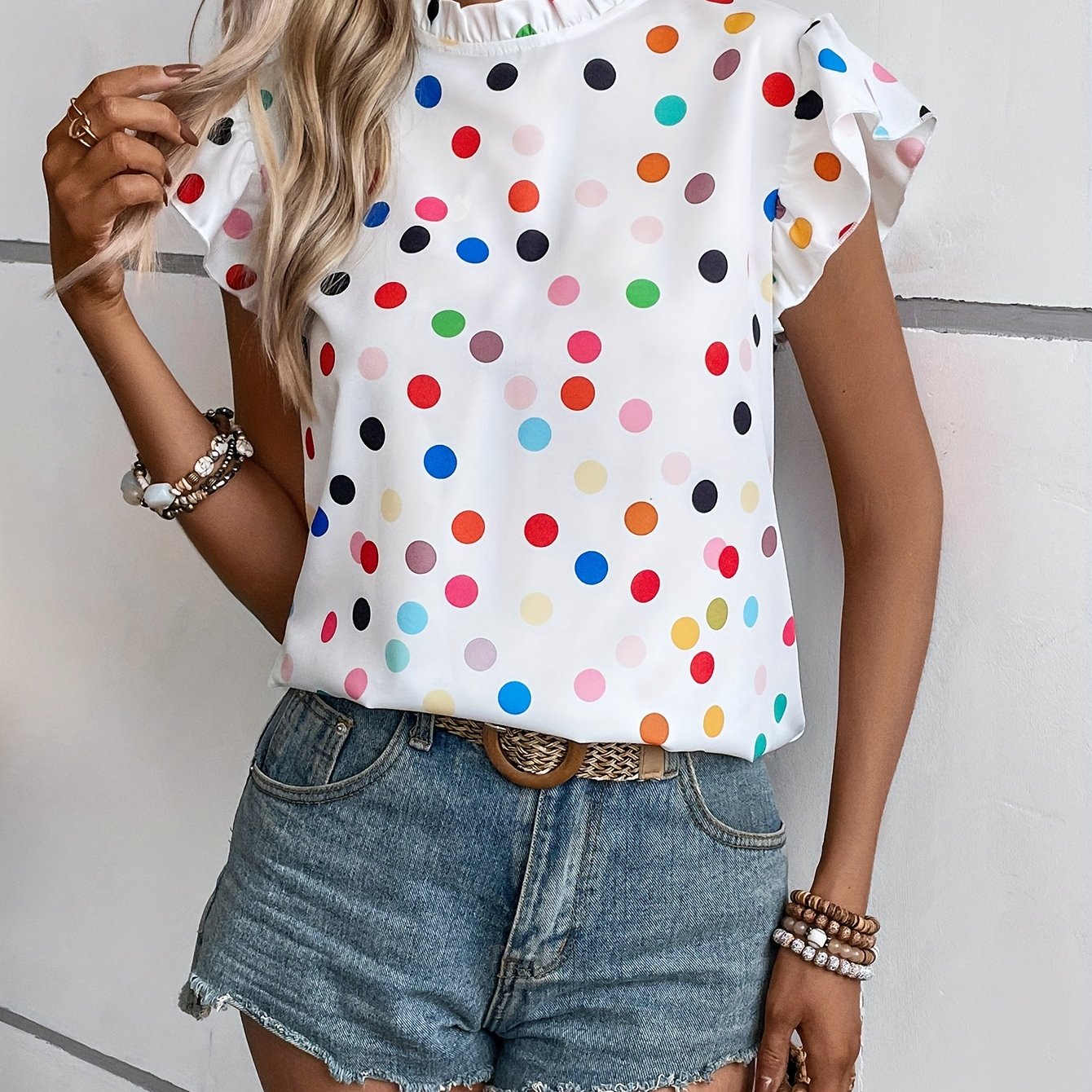 A very good quality Polka-dot Ruffle Trim Blouse, Casual Crew Neck Blouse For Spring & Summer, Women’s Clothing for this price, I am very happy great thanks.