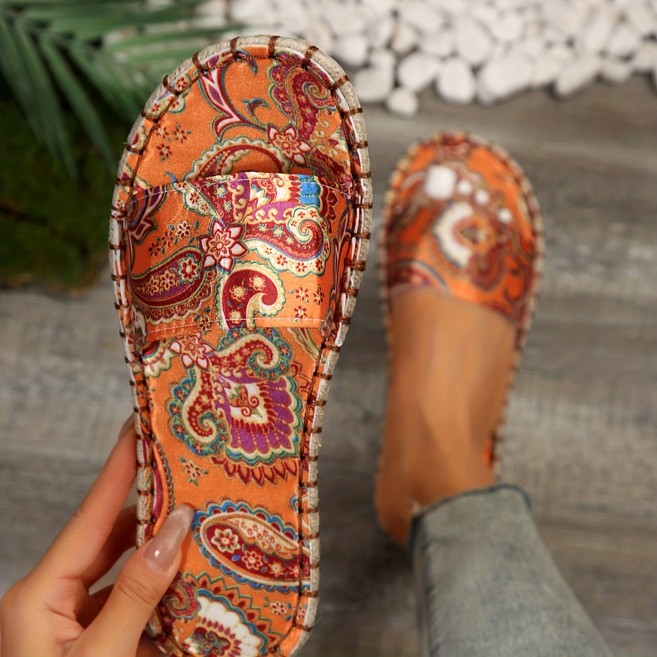 Women’s Trendy Ethnic Pattern Slippers, Casual Open Toe Non Slip Linen Slide Sandals, Comfortable Beach Shoes